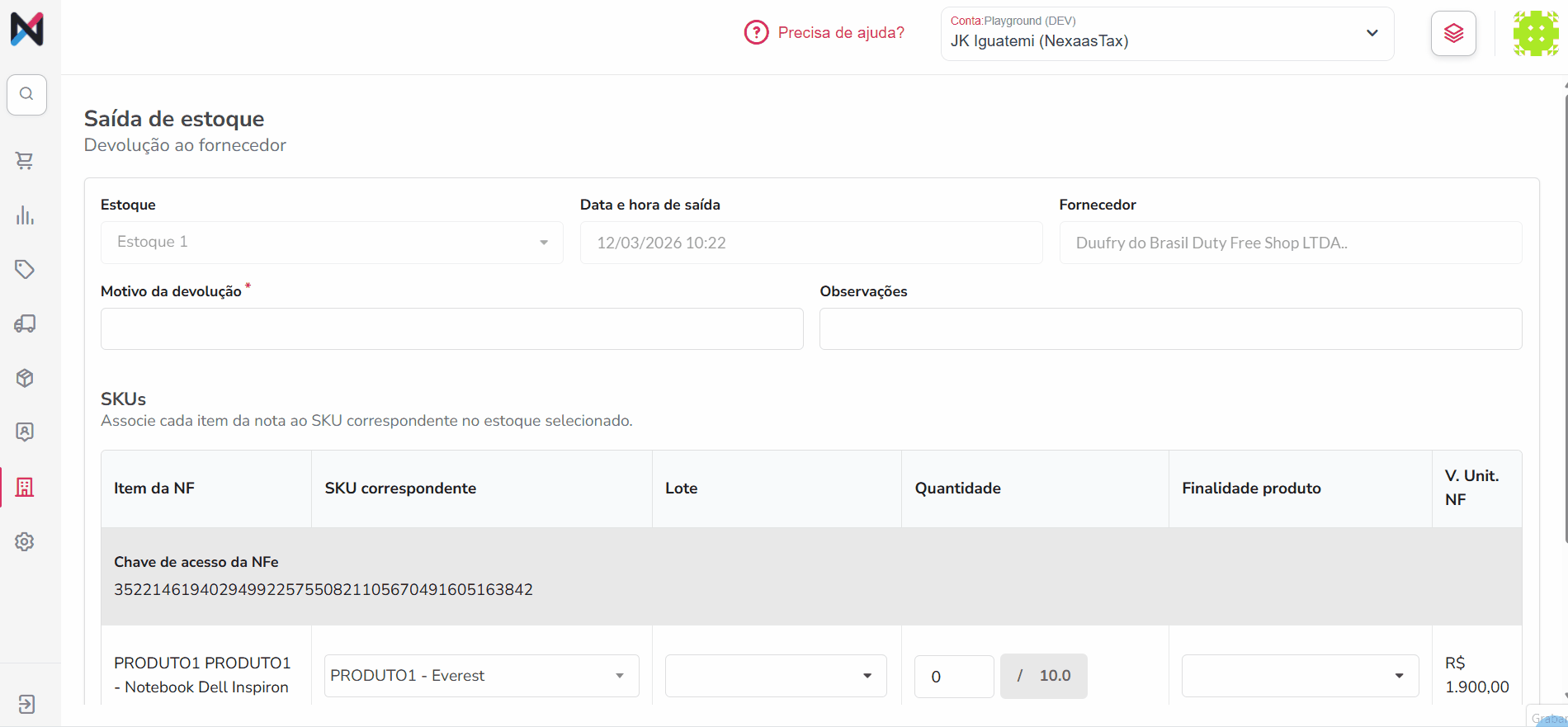 Para garantir a precisão dos dados, a devolução para um fornecedor não ocorre de maneira manual. O processo é realizado obrigatoriamente através do arquivo XML da nota fiscal de entrada.