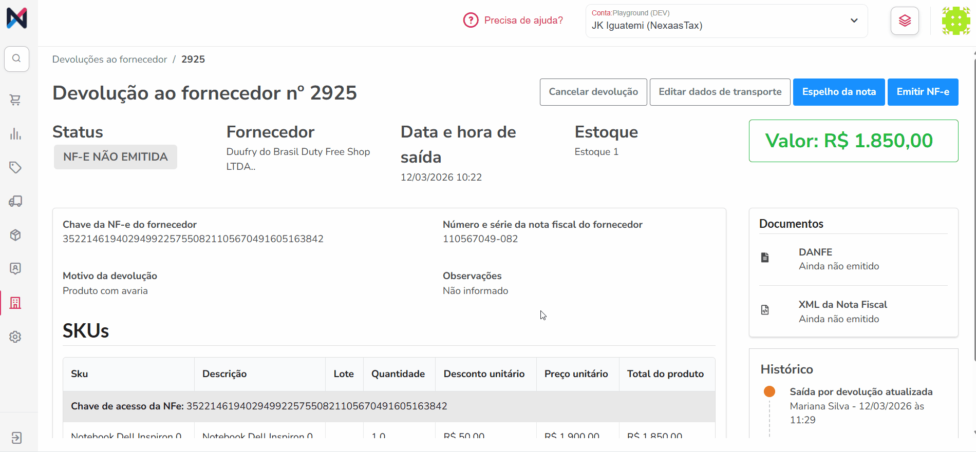 🔎 Lembre-se: o espelho da nota não tem valor fiscal. Ele é uma ferramenta exclusiva para conferência. A NF-e de devolução oficial será gerada no passo seguinte.