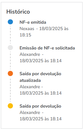 - Histórico: uma linha do tempo que registra cada etapa do processo incluindo quem realizou a ação e o horário exato:
