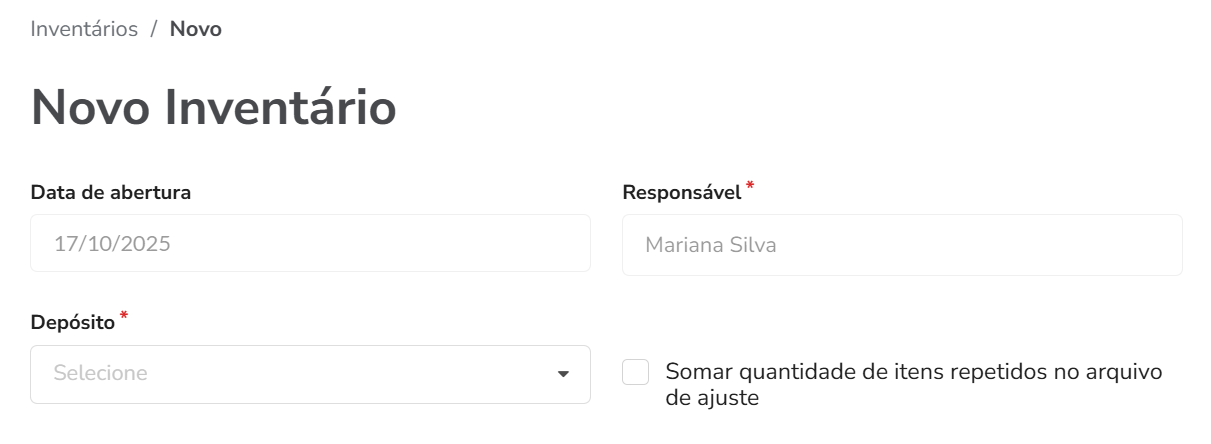 | Responsável | Indica o nome do usuário que está iniciando o inventário. Isso ajuda na organização e na rastreabilidade das ações. |
