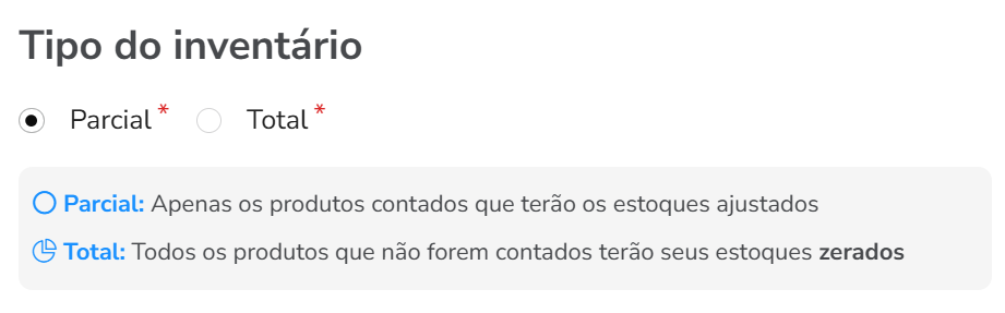 ⚪ Inventário Parcial: é a escolha ideal quando você precisa realizar contagens mais focadas e específicas - por exemplo, só camisetas em um determinado dia.