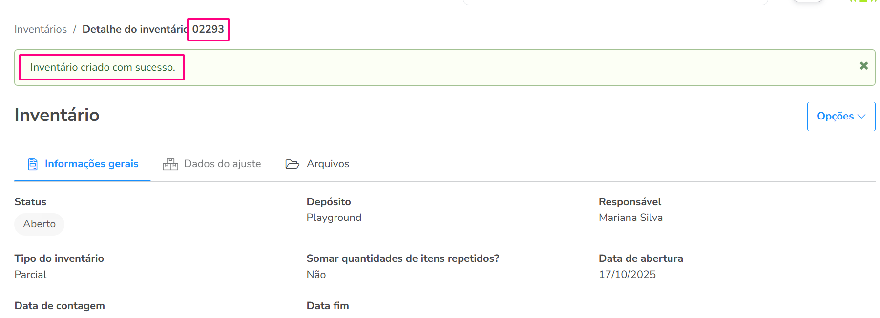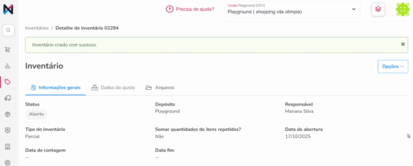 Você será direcionado para uma nova página que exibirá um resumo das informações gerais do inventário. Você verá uma mensagem verde no topo da tela, como Inventário criado com sucesso, confirmando que o registro foi gerado (além de exibir o número de referência do seu inventário):