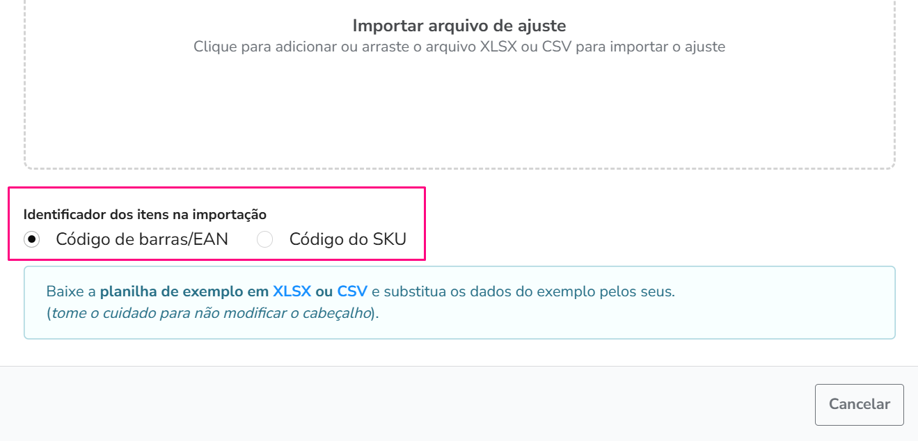 Nesta etapa, você deve optar por um dos dois tipos de identificadores dos itens na importação: por Código de barras/EAN ou por Código do SKU: