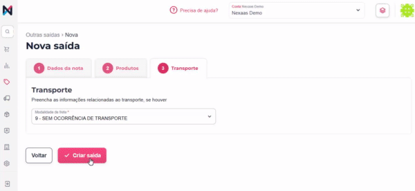 - Transporte: nesta última etapa, você poderá informar os detalhes do transporte, caso a saída envolva movimentação física dos produtos. Esta etapa será liberada após preencher os dados da nota.