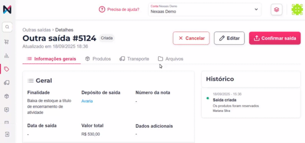 Na parte superior direita da tela, algumas ações podem ser realizadas através dos botões Cancelar (permite cancelar a saída, se ainda não estiver processada ou se houver um erro que exija a anulação), Editar (clicar aqui o levará de volta às etapas de edição da saída, permitindo alterar dados como produtos, informações de transporte, etc) e Confirmar saída (botão final para processar e efetivar a saída, geralmente após a conferência de todos os dados e a emissão de documentos necessários).