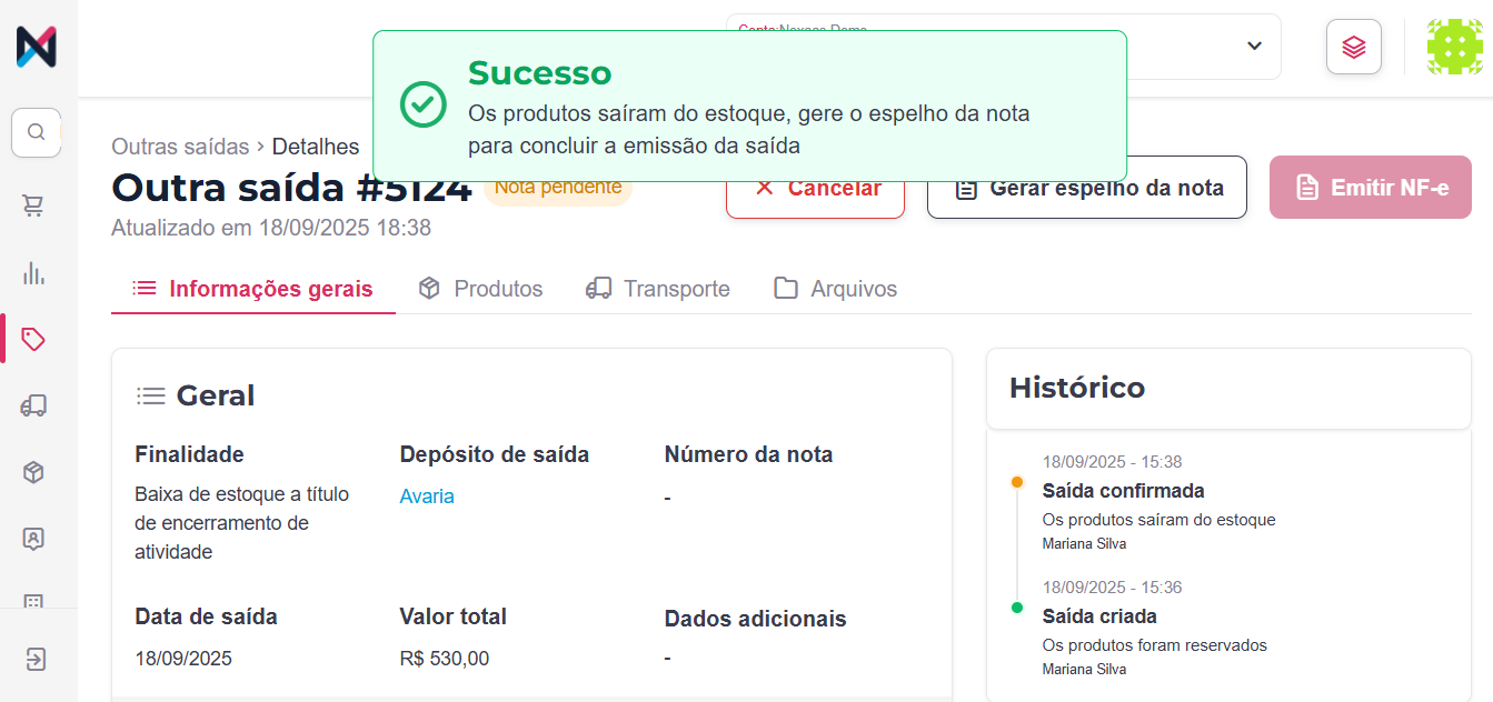 Após alguns instantes o espelho da sua NF-e será gerado automaticamente pelo Nexaas OMS e estará disponível para download na aba Arquivos. Essa ação será descrita através uma de pop-up no topo da página e, nesta etapa, o status da saída é Nota Pendente: ela demonstra que a nota fiscal ainda precisa ser emitida: