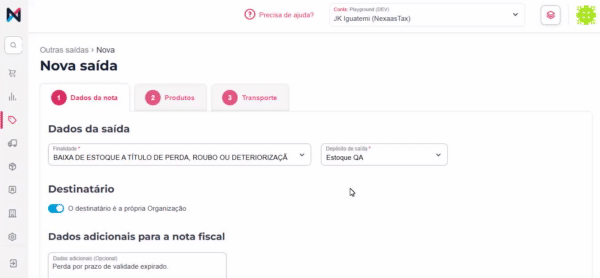 - Dados da nota: nesta primeira etapa, você definirá as informações essenciais da saída, incluindo a finalidade da movimentação, o depósito de origem e os dados do destinatário.