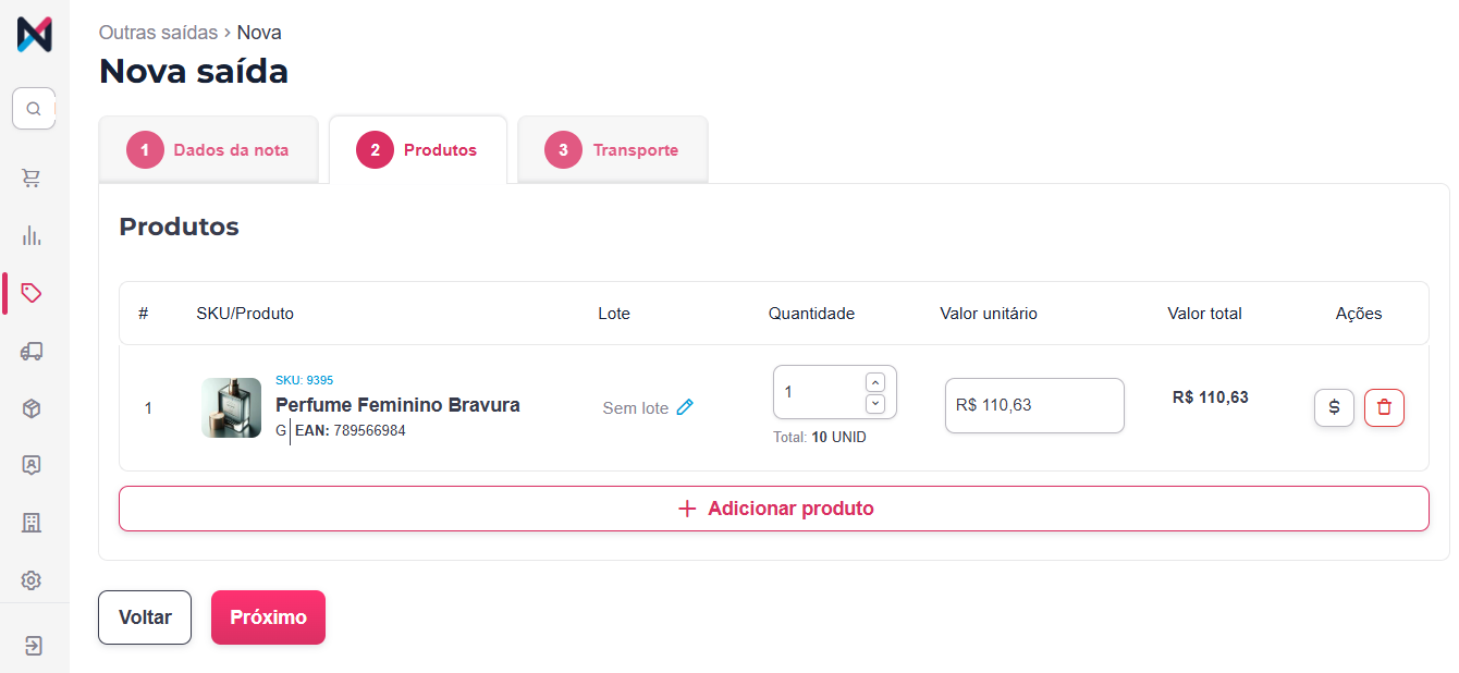 Preencher esta primeira aba com atenção é fundamental para garantir a correta emissão da nota fiscal e o registro preciso da baixa em seu estoque. Após revisar os dados desta primeira etapa, clique em Próximo: