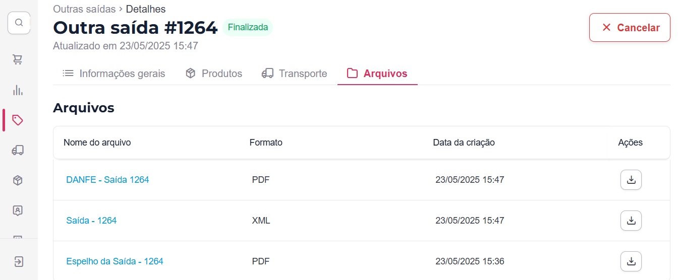 Aguarde alguns instantes. Se a emissão ocorrer com com sucesso, o status alterará para Finalizada, indicando que a saída foi corretamente registrada via NF-e. Para acessar tanto o XML quanto o PDF da NF-e, clique na aba Arquivos e realize o download: