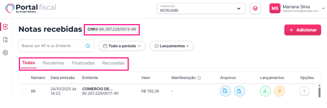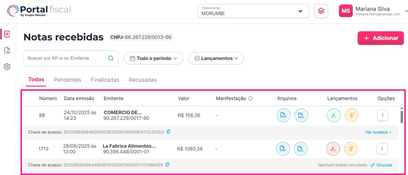 | Pendentes | Destaca as notas fiscais que precisam da sua atenção imediata. É aqui que você encontra todos os documentos que estão no meio do processo, aguardando uma ou mais ações. Basicamente, uma nota é considerada pendente quando o Portal Fiscal ainda espera alguma ação, podendo ser verificadas na coluna Lançamentos):