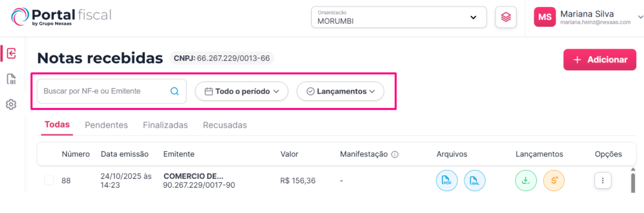 Para encontrar uma NF-e ou NFS-e, utilize a barra de pesquisa, localizada no canto superior esquerdo da tela. Além disso, você pode refinar sua busca com os filtros disponíveis: