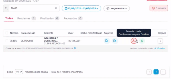 Ao concluir o processo, o status altera-se para Entrada finalizada e estoques lançados (ícone verde). |