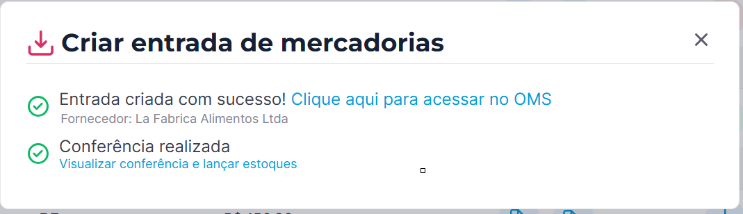 Representa que a entrada de mercadoria foi finalizada com sucesso, indicando que todas as etapas do processo foram devidamente realizadas. Ao clicar no ícone correspondente, você será redirecionado para a tela de entrada de mercadoria do Nexaas OMS: