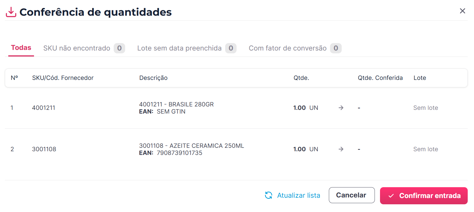 🔴 Alerta vermelho: esse alerta indica que há produtos na nota fiscal que não estão cadastrados no Nexaas OMS. Isso significa que os SKUs informados não foram reconhecidos pelo sistema e precisam ser revisados ou incluídos manualmente. Além disso, o alerta vermelho também pode sinalizar que há itens com controle obrigatório de lote, mas que estão incompletos. Por exemplo: o lote foi informado na nota, mas a data de validade não foi preenchida. Como o Nexaas OMS exige esse dado para concluir a entrada, o preenchimento deve ser feito diretamente no Nexaas OMS. —————————————————————————————————— 🟡 Alerta amarelo: indica que alguns produtos possuem fator de conversão, e é necessário verificar se a quantidade recebida está de acordo com esse fator. Essa etapa é essencial para garantir que os dados estejam corretos e que o estoque seja atualizado com precisão. 📌 Como resolver: após cadastrar os produtos ou complementar as informações obrigatórias, basta retornar à tela de conferência e clicar em Atualizar lista para que o sistema reavalie os dados e atualize o status dos itens. Após, o botão Confirmar entrada estará habilitado para clique: ao clicar, o processo de entrada de produto será realizado. |