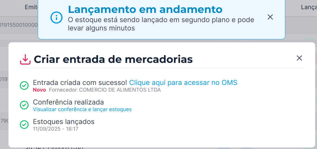 Após a confirmação, exibiremos uma mensagem azul no topo da tela do Portal Fiscal, indicando que o lançamento está em andamento. Assim que a entrada for concluída com sucesso, você será notificado e um novo item será exibido na janela, informando a data e hora da importação finalizada no Nexaas OMS: