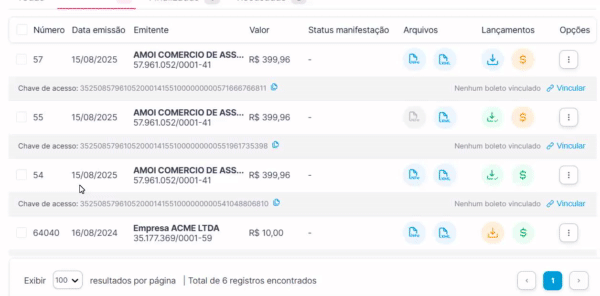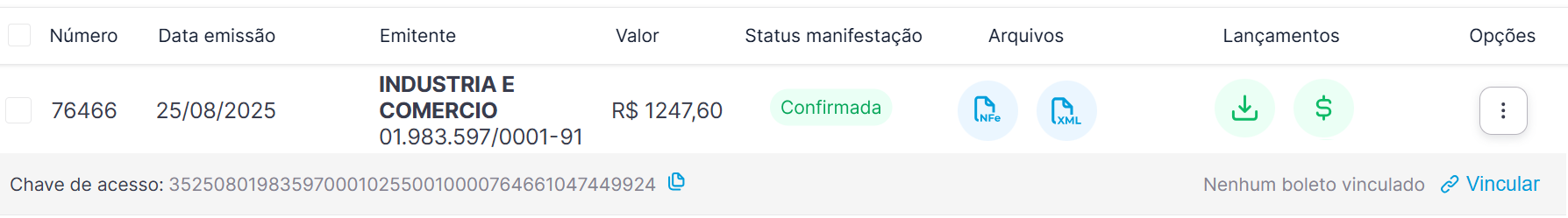Representado por um símbolo de cifrão, esse ícone mostra se a nota fiscal já foi vinculada a um lançamento financeiro no Fintera. Isso garante que o documento está integrado ao fluxo de contas a pagar da empresa. Confira os status disponíveis: