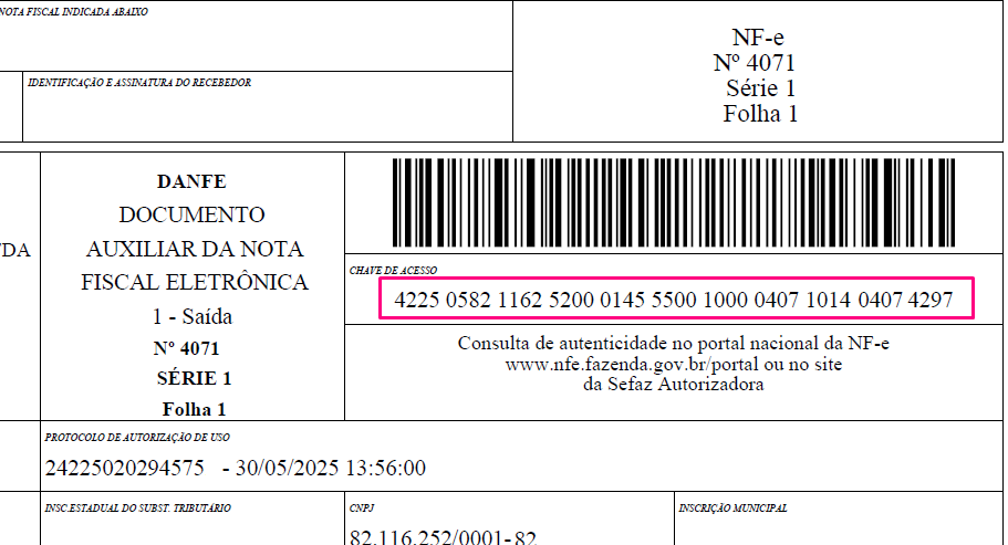 💡 Dica: a chave de acesso é uma sequência de exatamente 44 números. Você a encontra facilmente no canto superior direito da DANFE (Documento Auxiliar da Nota Fiscal Eletrônica), o resumo impresso da sua NF-e: