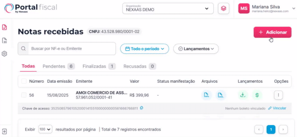 Esta funcionalidade é perfeita para situações específicas, como quando um fornecedor envia a nota diretamente para o seu e-mail ou quando você precisa adicionar um documento que não entrou pelo nosso fluxo de busca automática. Confira: