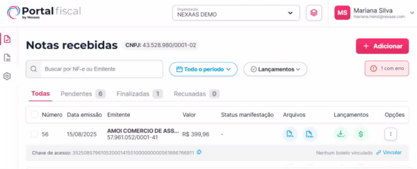 - O XM enviado será adicionada instantaneamente à sua lista de documentos, assim como a DANFE. Agora, você está pronto para as próximas etapas como conferência, entrada de mercadoria e vinculação financeira.