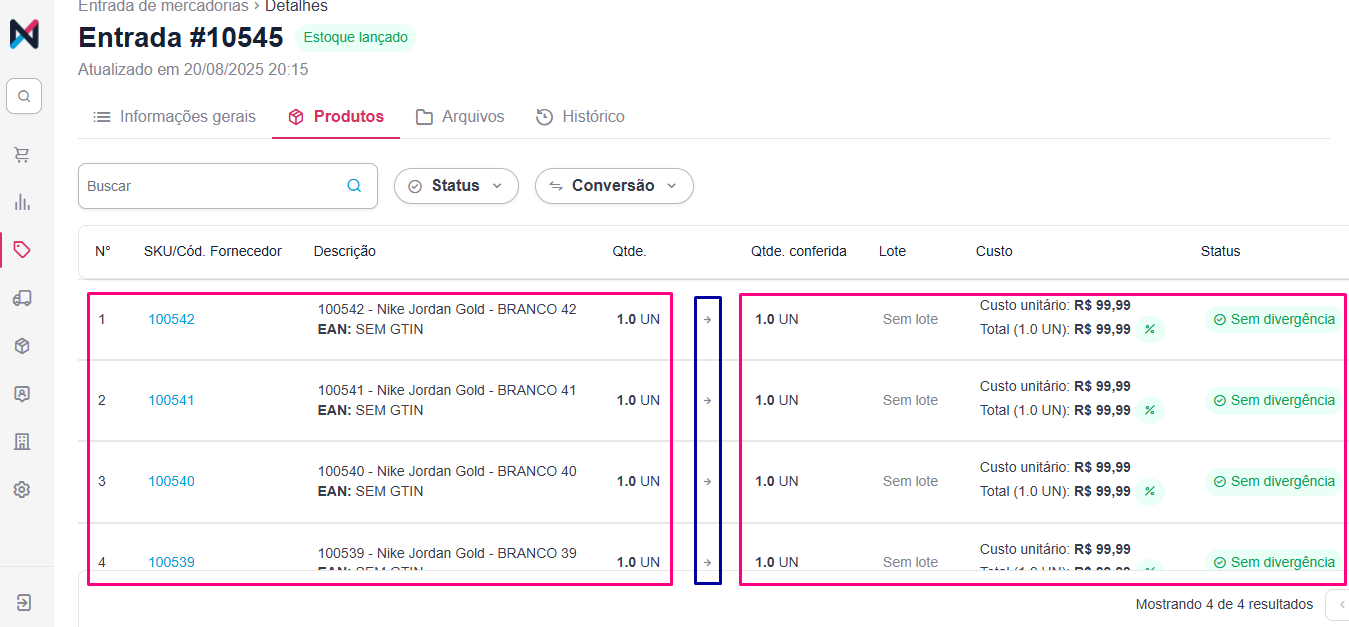 Você pode visualizar e comparar de forma clara os itens da nota fiscal com os produtos que você recebeu e conferiu no seu estoque. Cada linha representa um produto, e a seta (→) divide as informações em duas seções: