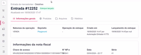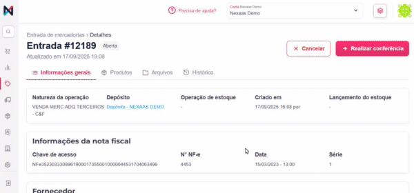 | Detalhes da operação | No topo da página, você encontra os dados internos da operação de entrada de mercadoria como Natureza da operação, Depósito e demais informações. |