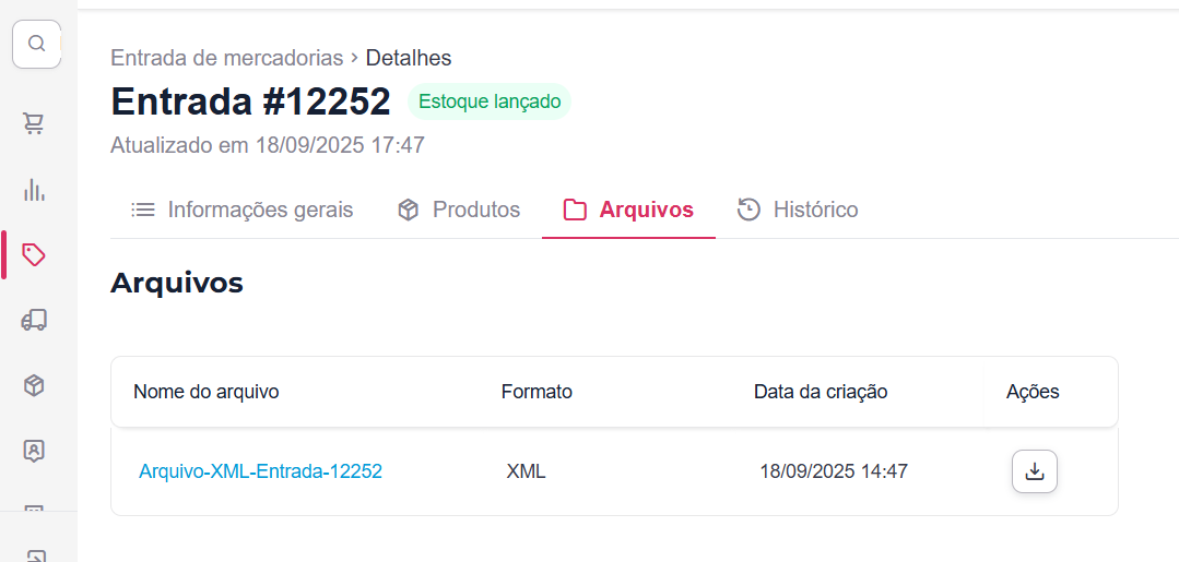Exibe uma lista de todos os documentos que foram associados a este processo de entrada, como o XML de entrada importado, por exemplo. Ao clicar no ícone de download (flecha para baixo), o arquivo original será salvo diretamente em seu computador: