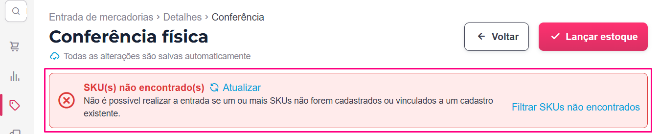 - Filtrar SKUs não encontrados: um atalho para exibir na lista apenas os produtos que estão com esta pendência;