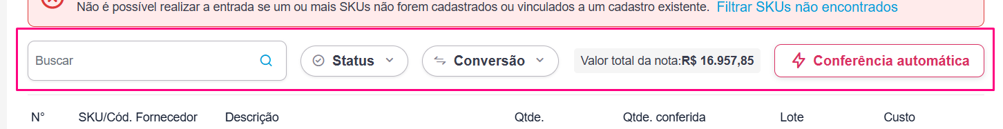 Esta barra oferece ferramentas para agilizar sua conferência, especialmente em notas com muitos itens: