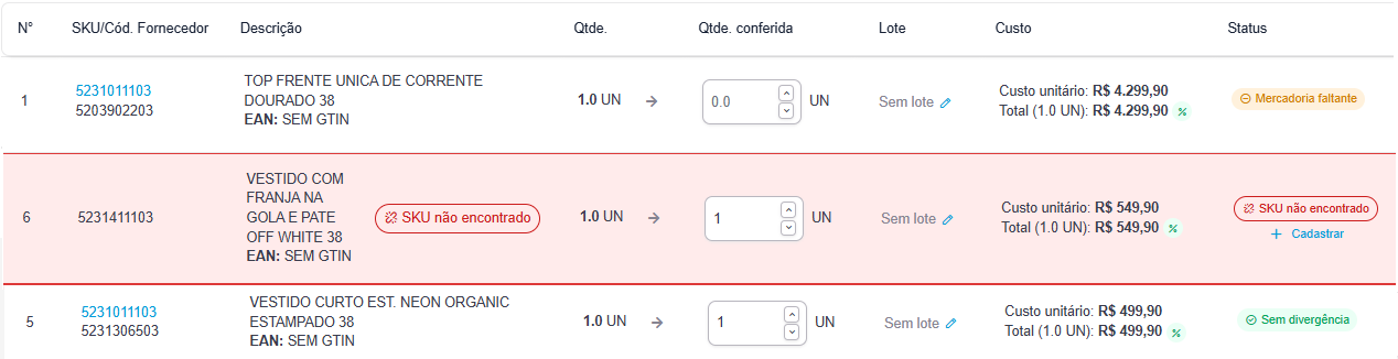 | Status | Fornece um feedback visual instantâneo para cada item. 💡 Dica: conheça em detalhes cada um dos status acessando o artigo de ajuda Conhecendo as abas de entrada de mercadoria. |
