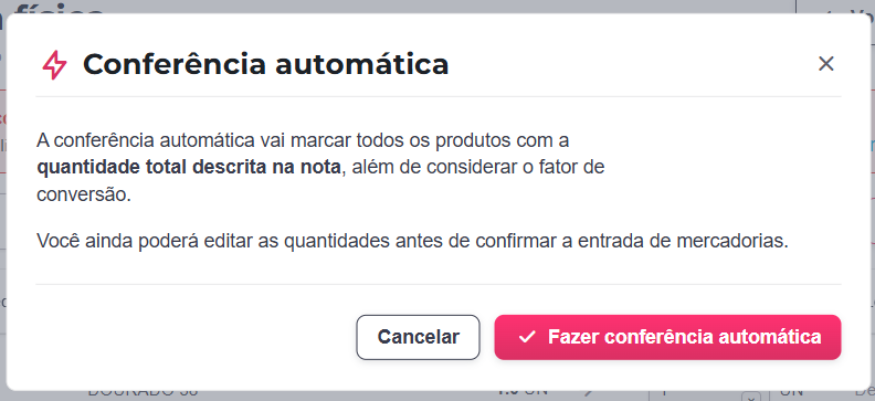 Ao clicar sobre, uma tela explicativa será exibida: para confirmar, clique em Fazer conferência automática; para cancelar e sair, clique em Cancelar.