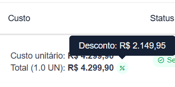 | Custo | Exibe o custo unitário e total do item. Pode exibir um ícone verde caso o item tenha recebido desconto na nota fiscal:
