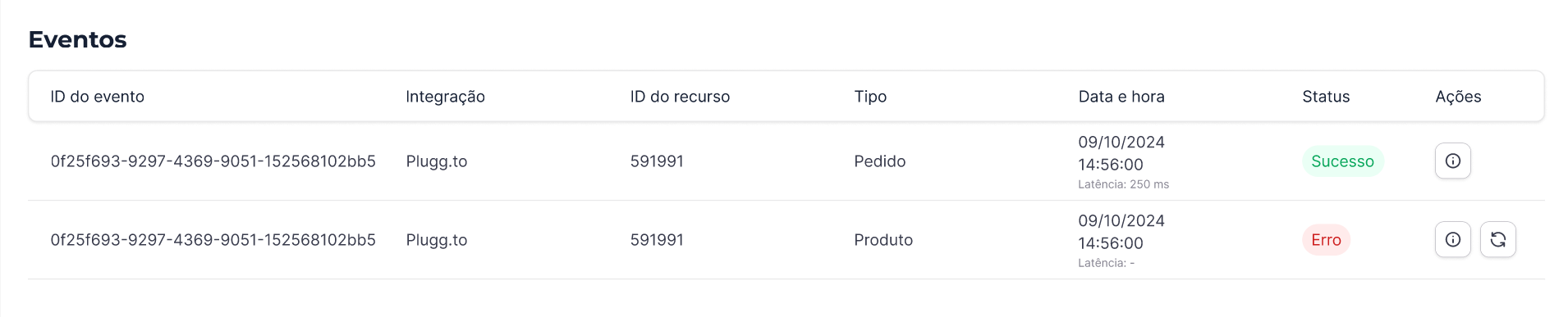 Na parte inferior da tela, a tabela Eventos listará todos os eventos de integração para que você possa analisar cada um individualmente: