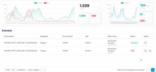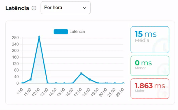 A latência é o tempo que a integração leva para processar uma informação. Você pode acompanhar a média (azul), o menor (verde) e o maior (vermelho) tempo de resposta registrados, o que ajuda a identificar gargalos e problemas de performance.
