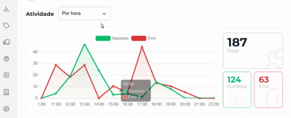 As linhas coloridas indicam a quantidade de eventos com sucesso (verde) e com erro (vermelho). Você pode passar o mouse sobre os pontos do gráfico para ver a contagem exata de cada período. No canto direito, a seção Total mostra o número total de eventos no período selecionado, assim como Sucesso e Erro.