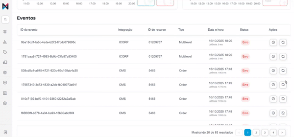 Nesta tela, você vai encontrar informações sobre o volume de eventos, o tempo de resposta e detalhes de cada evento de integração. As integrações podem ser variadas, como as de SKU, preço, pedido ou até mesmo de transportadora. Vamos lá!