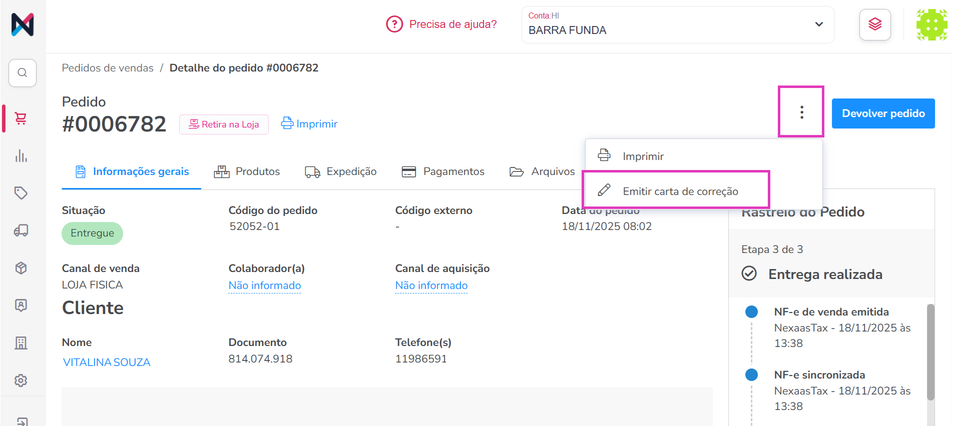Na tela de Detalhe do Pedido, localize o ícone de três pontinhos (...) na área superior direita da tela e clique sobre. Após, no menu que se abrir, selecione a opção Emitir carta de correção: