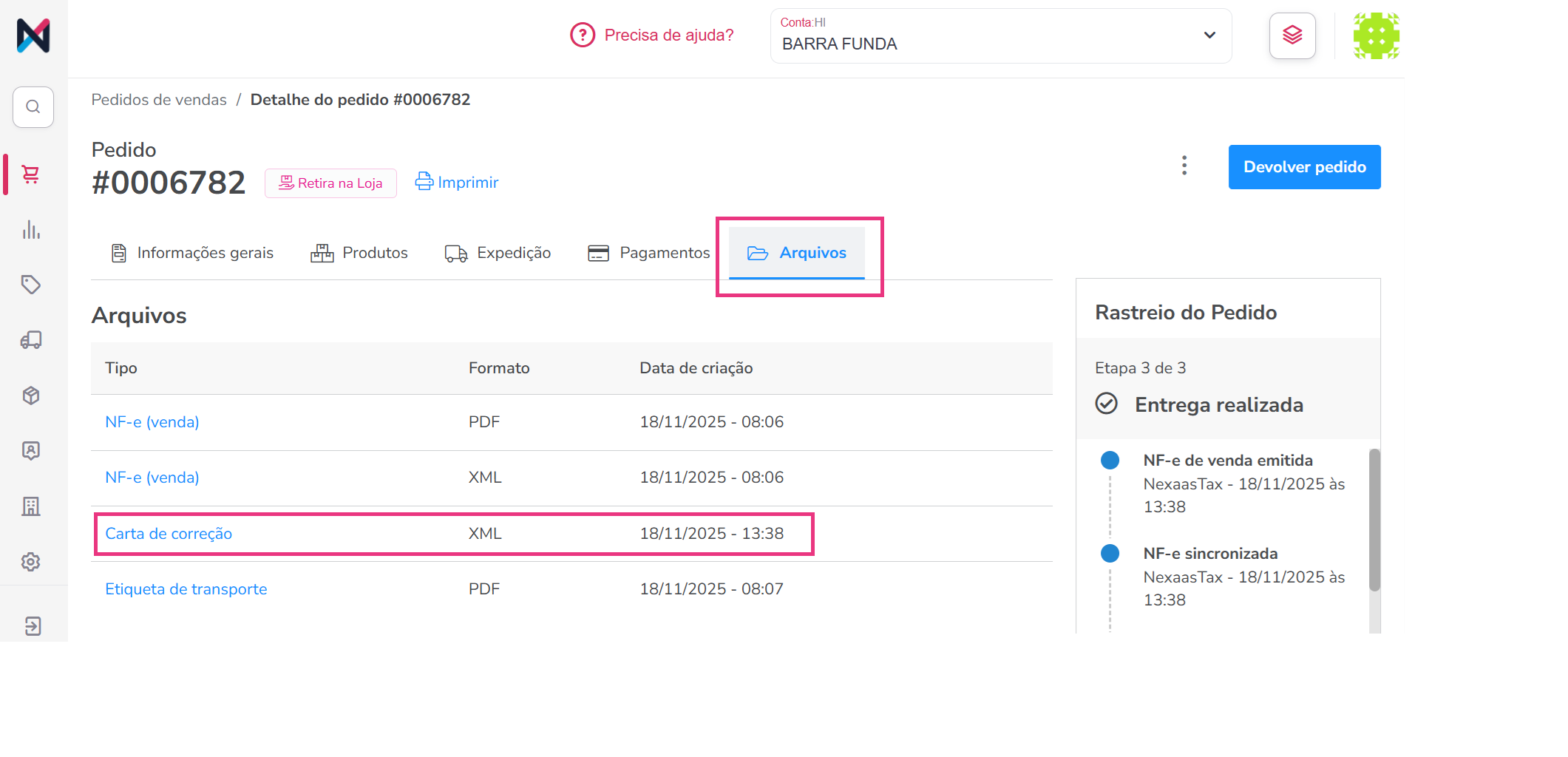 Você será redirecionado de volta à tela principal do pedido. Para acessar o conteúdo da CC-e, acesse a aba Arquivos: nesta aba, você encontrará o histórico de emissões e ações da carta de correção.