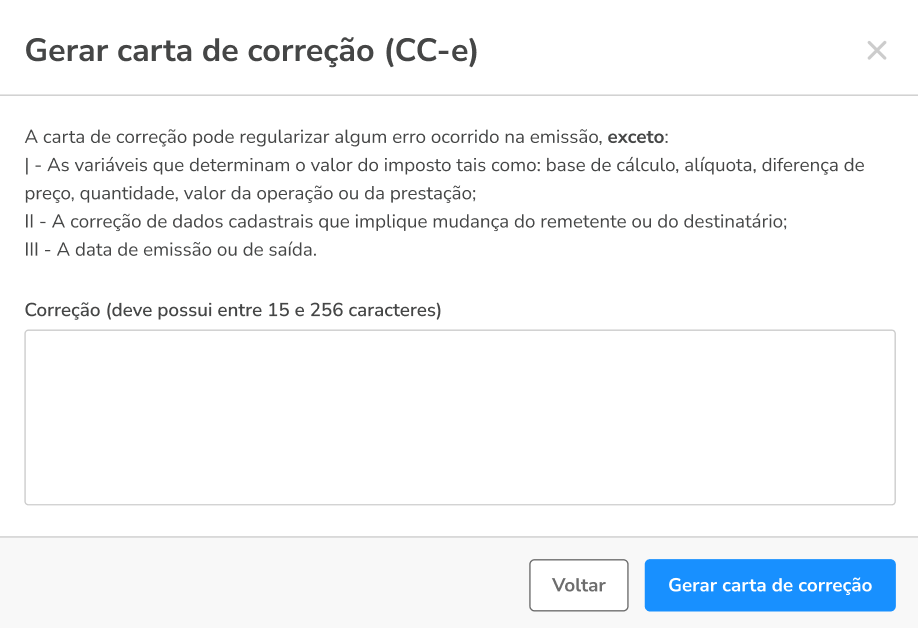 💡 Dica: para emitir uma CC-e corretamente, acesse o artigo de ajuda Carta de Correção: o que pode e não pode ser corrigido e saiba mais. Lembre-se que o texto deve conter entre 15 e 256 caracteres!