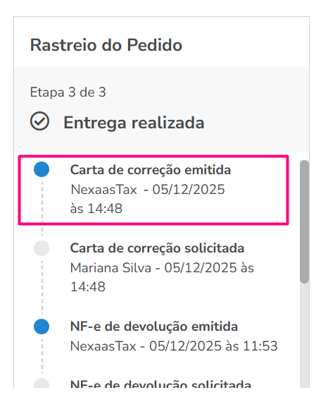 ⚠️ Atenção: pode levar alguns minutos até que o evento da CC-e apareça na página. Se você já emitiu a Carta de Correção no Nexaas OMS e ela não estiver visível, aguarde e tente novamente mais tarde.