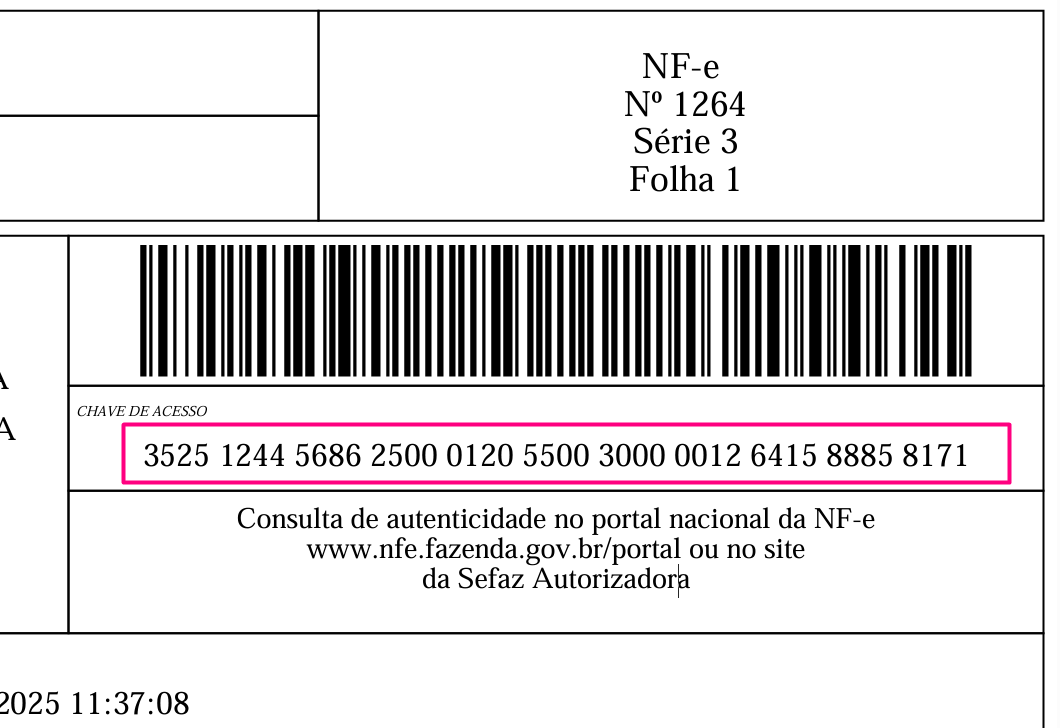 2. Copie a chave da NF-e: você precisará copiar a chave de acesso da NF-e (código de 44 dígitos). Essa chave pode ser obtida tanto no DANFE (PDF) quanto no XML da NF-e: