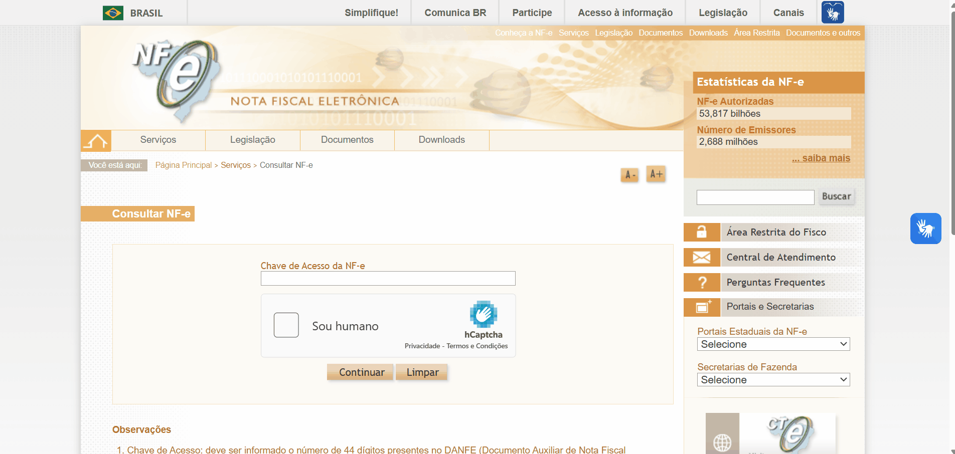 3. Acesse o site da Fazenda: entre no site oficial da Consulta NF-e e cole a chave no campo Chave de Acesso da NF-e. Depois, realize as verificações solicitadas e clique em Continuar: