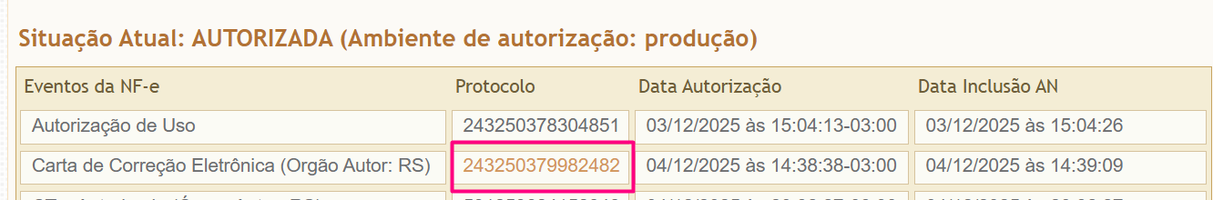4. Localize o evento da Carta de Correção: na tela que exibe os dados da NF-e, role até o último quadrante chamado Eventos da NF-e. Clique no número exibido na coluna Protocolo, referente ao evento Carta de Correção Eletrônica (geralmente o segundo evento):