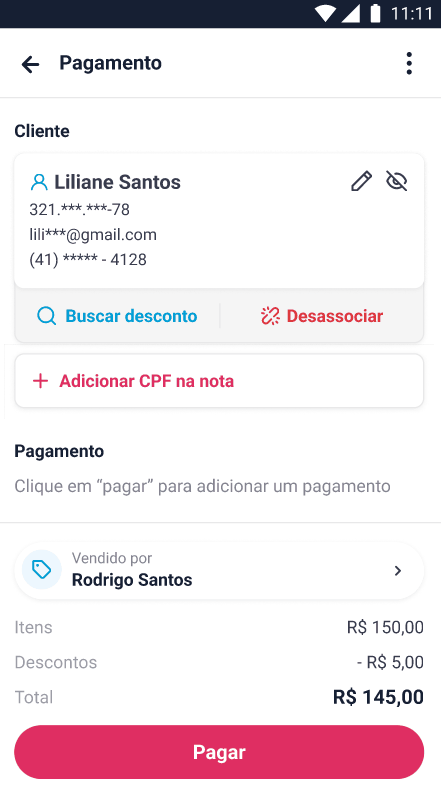 Para começar, abra o aplicativo Nexaas PDV e insira suas credenciais de acesso (usuário e senha). No menu inicial, adicione o cliente e os produtos ao carrinho como de costume.