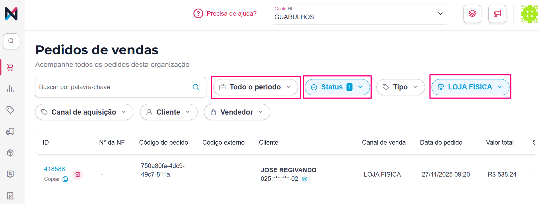 Para acompanhar esses pedidos no Nexaas OMS, acesse o menu Vendas clique na opção Pedidos de Vendas. Após, aplique os seguintes filtros: