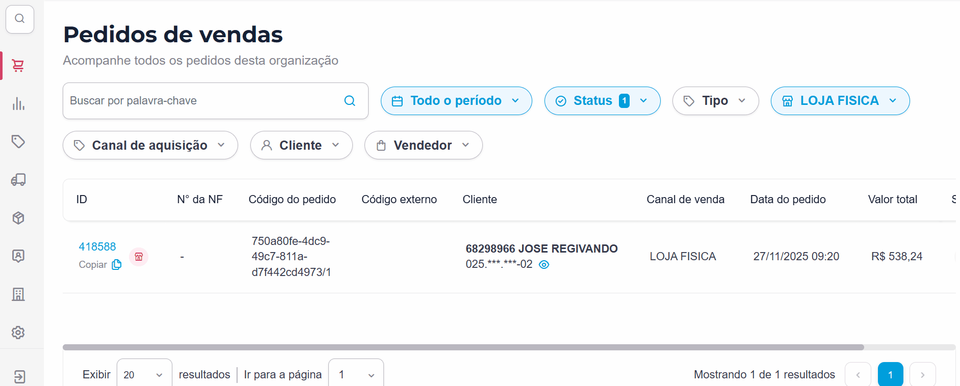 - No Nexaas OMS, o pedido estará sob o status de Pedido Incluído e o canal de venda será Loja Física.