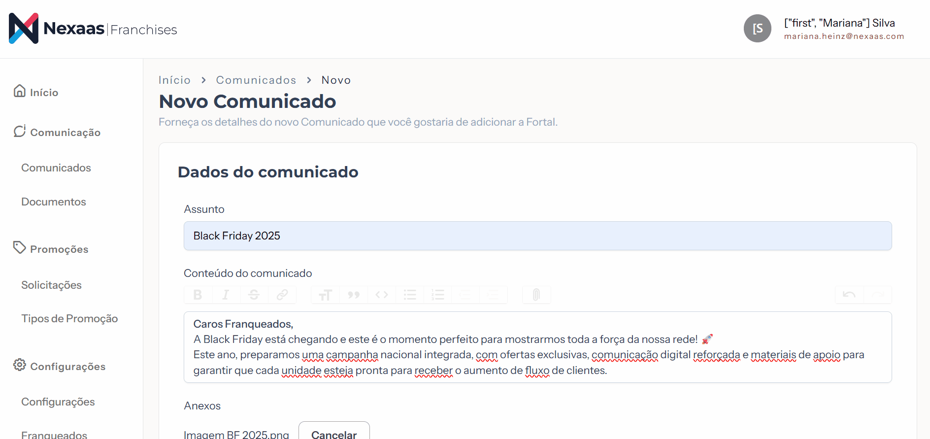 💡 Dica: o envio será realizado para os grupos de franqueados selecionados no campo Para quem será enviado?. Para incluir ou atualizar, acesse o menu Franqueados e revise os dados de cada unidade.