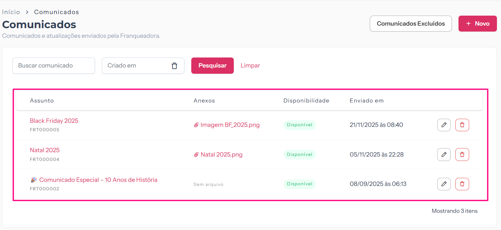 Já na área principal da tela, você encontra os comunicados criados, organizados em formato de lista. Conheça: