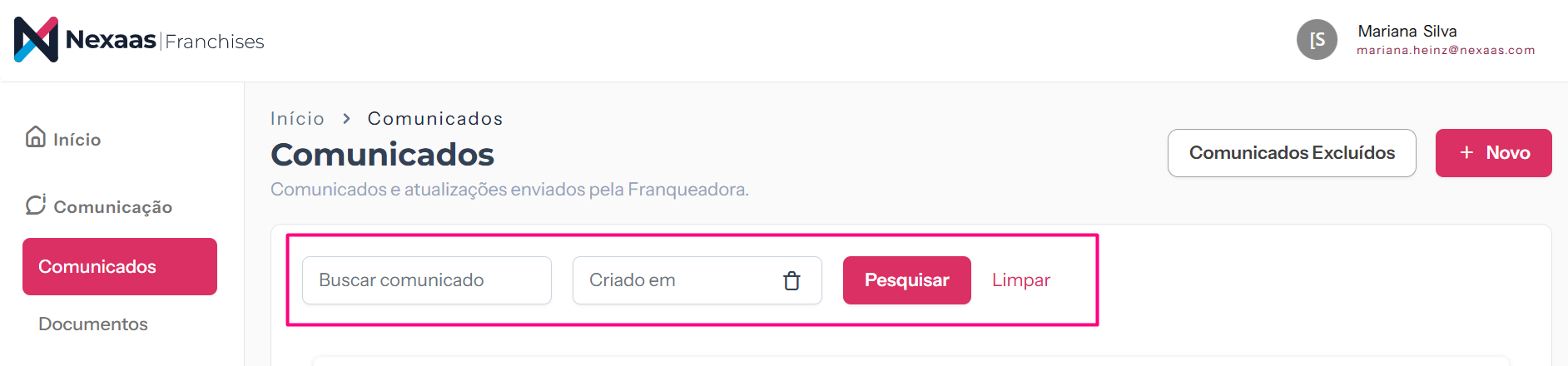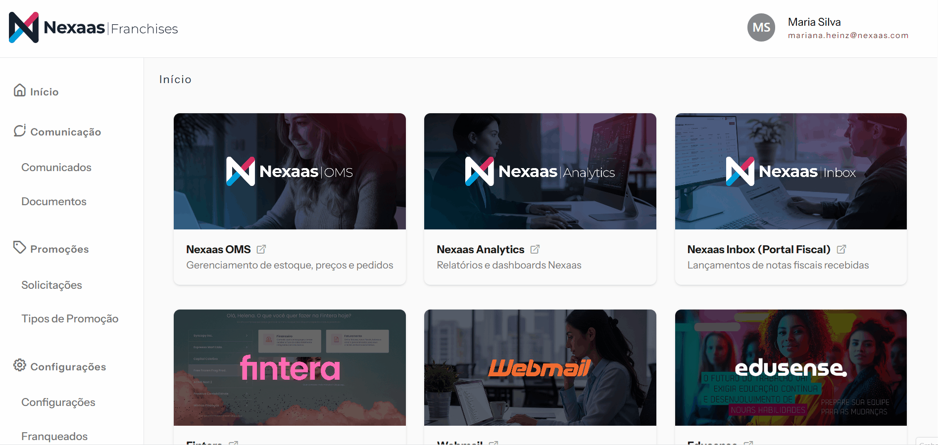 Comece acessando o Nexaas Franchises, realizando login com o Nexaas ID. Após, no menu principal lateral, na seção Comunicação, clique na opção Comunicados: