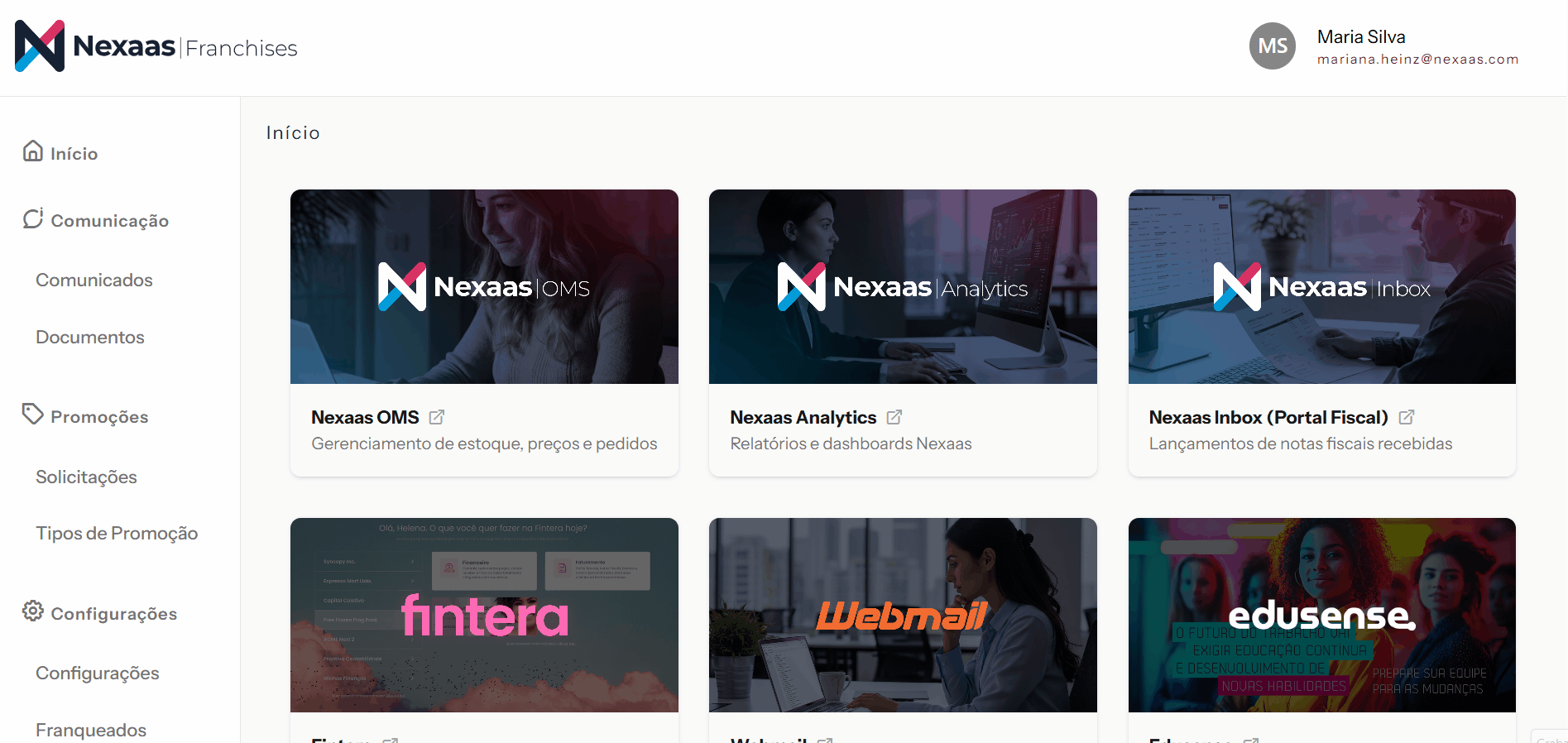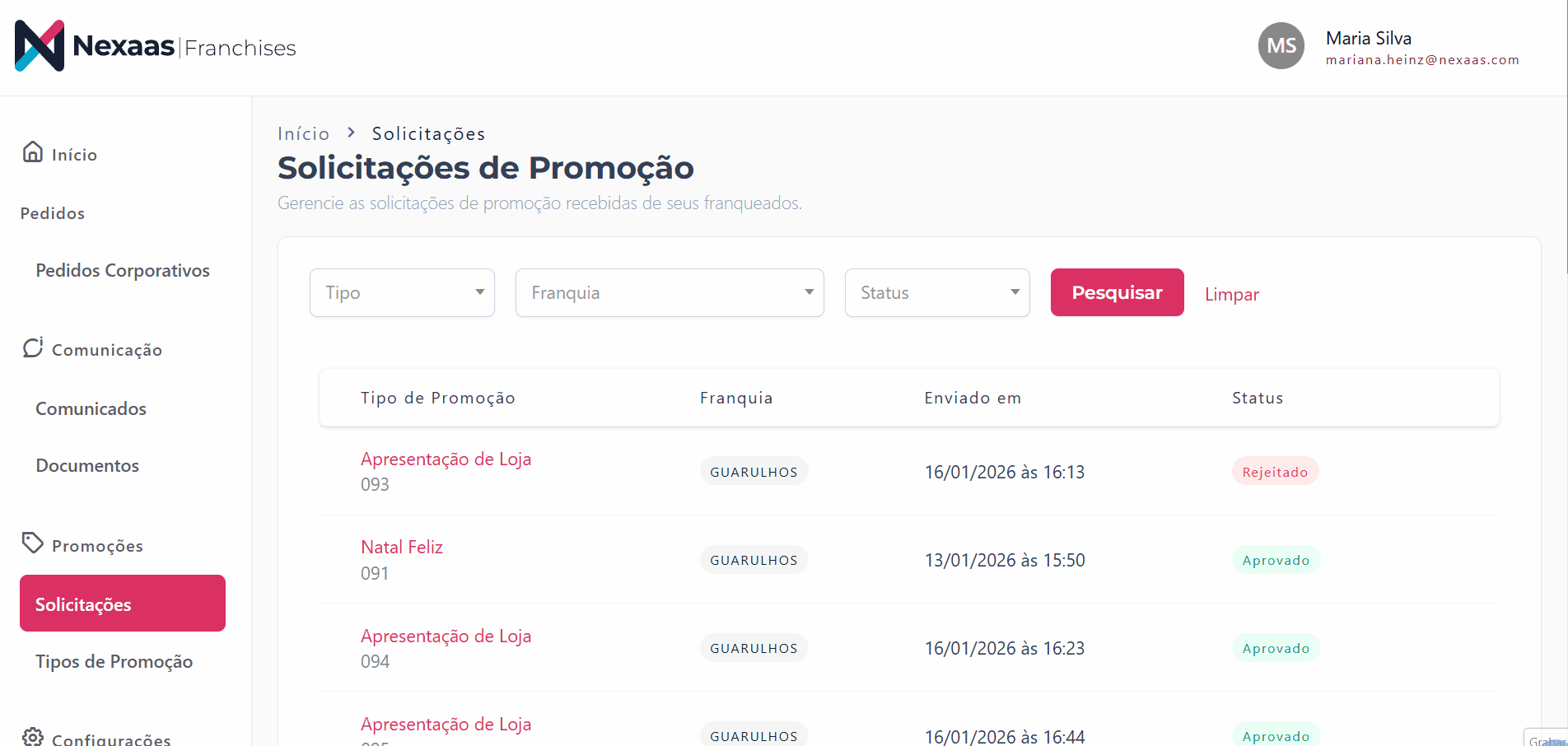 Comece acessando o Nexaas Franchises, realizando login com o Nexaas ID. Após, no menu principal lateral, na seção Promoções, clique na opção Solicitações: