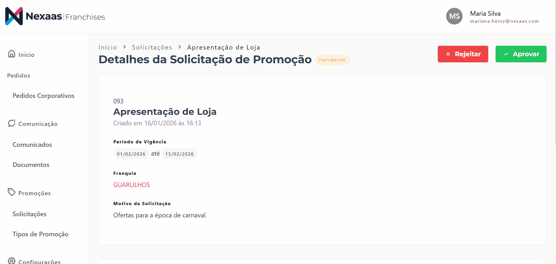 ✅ Aprovar: valida e libera a promoção imediatamente para a franquia.